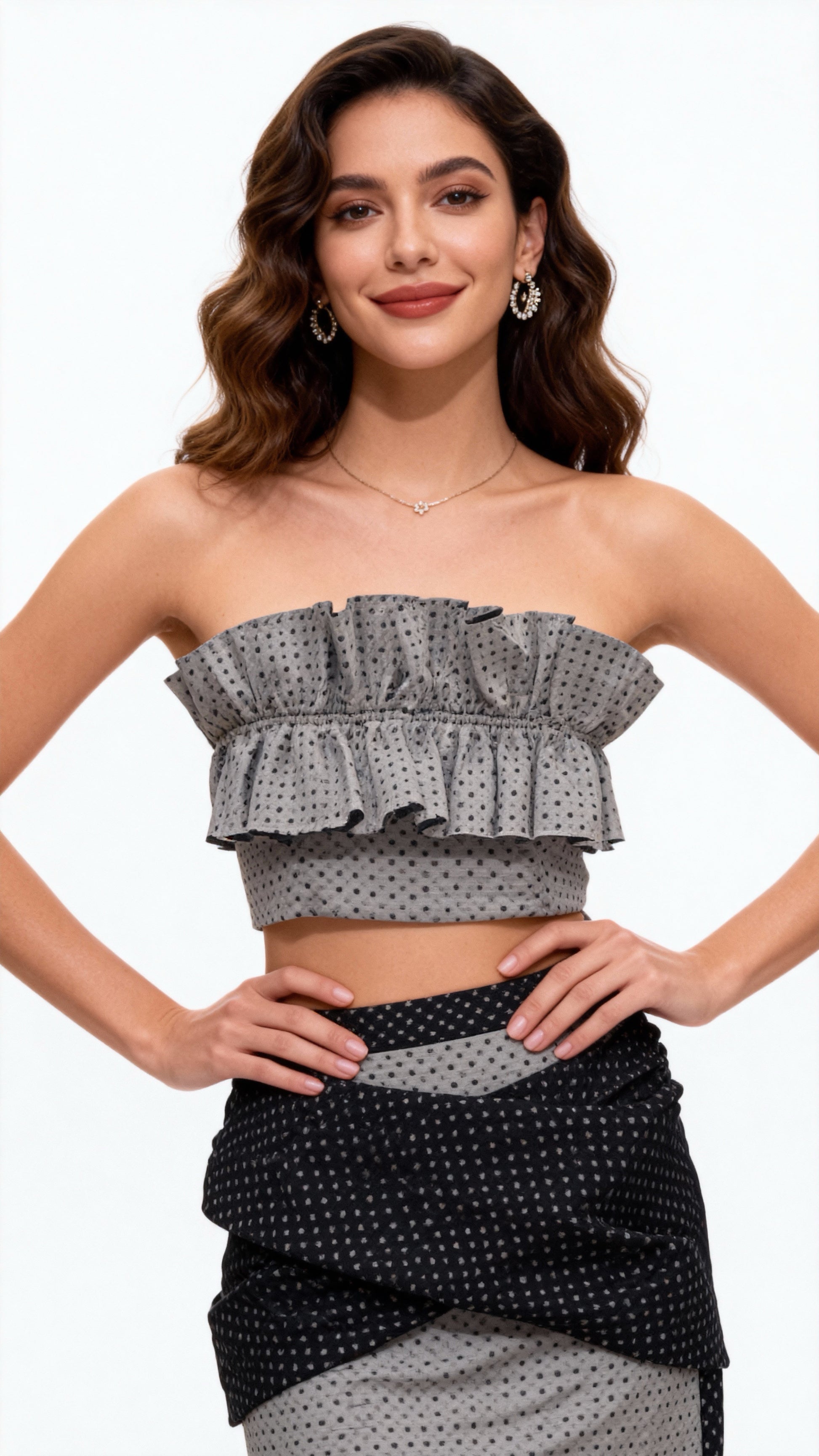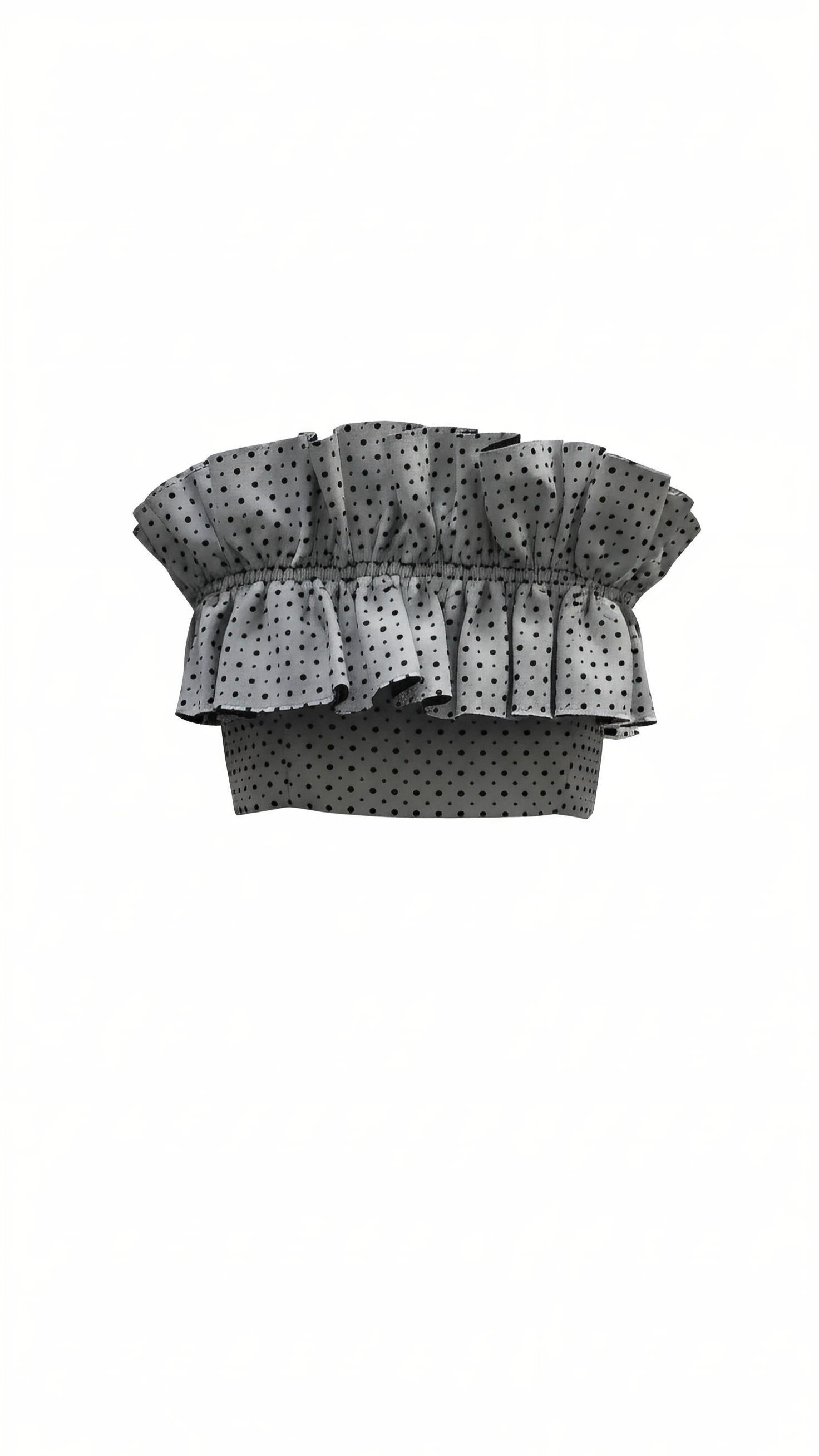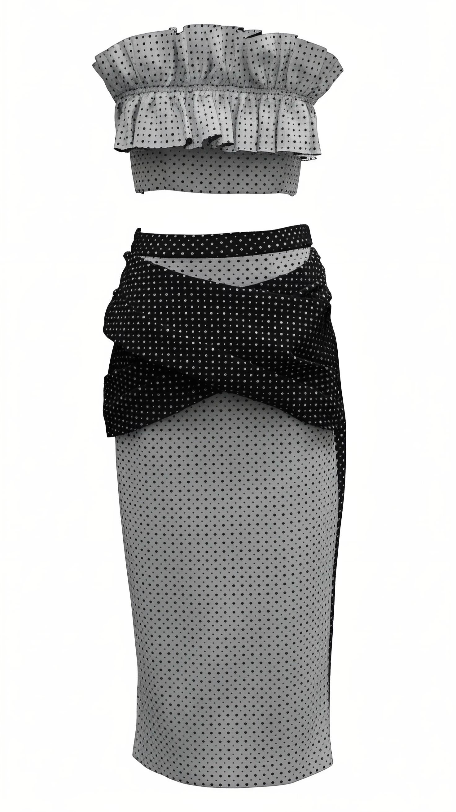 Silhouette:Features a cropped bustier top (adorned with double-layered ruffled trim, boasting a cropped silhouette that reveals the midriff) + a high-waisted figure-hugging midi skirt. The skirt showcases a black-gray polka dot color-blocked design, which hugs the body closely while adding dimensionality and visual depth to the overall look.