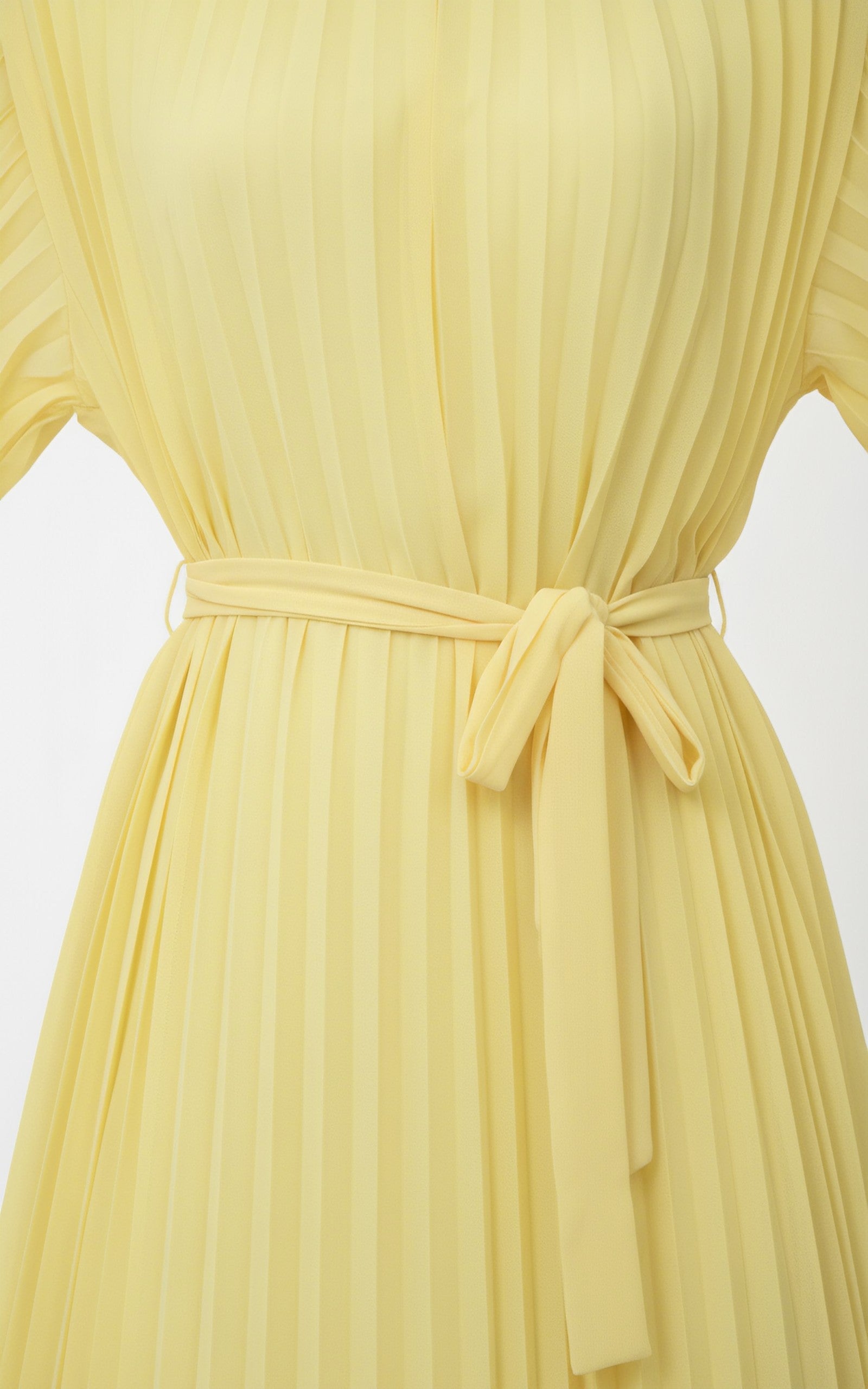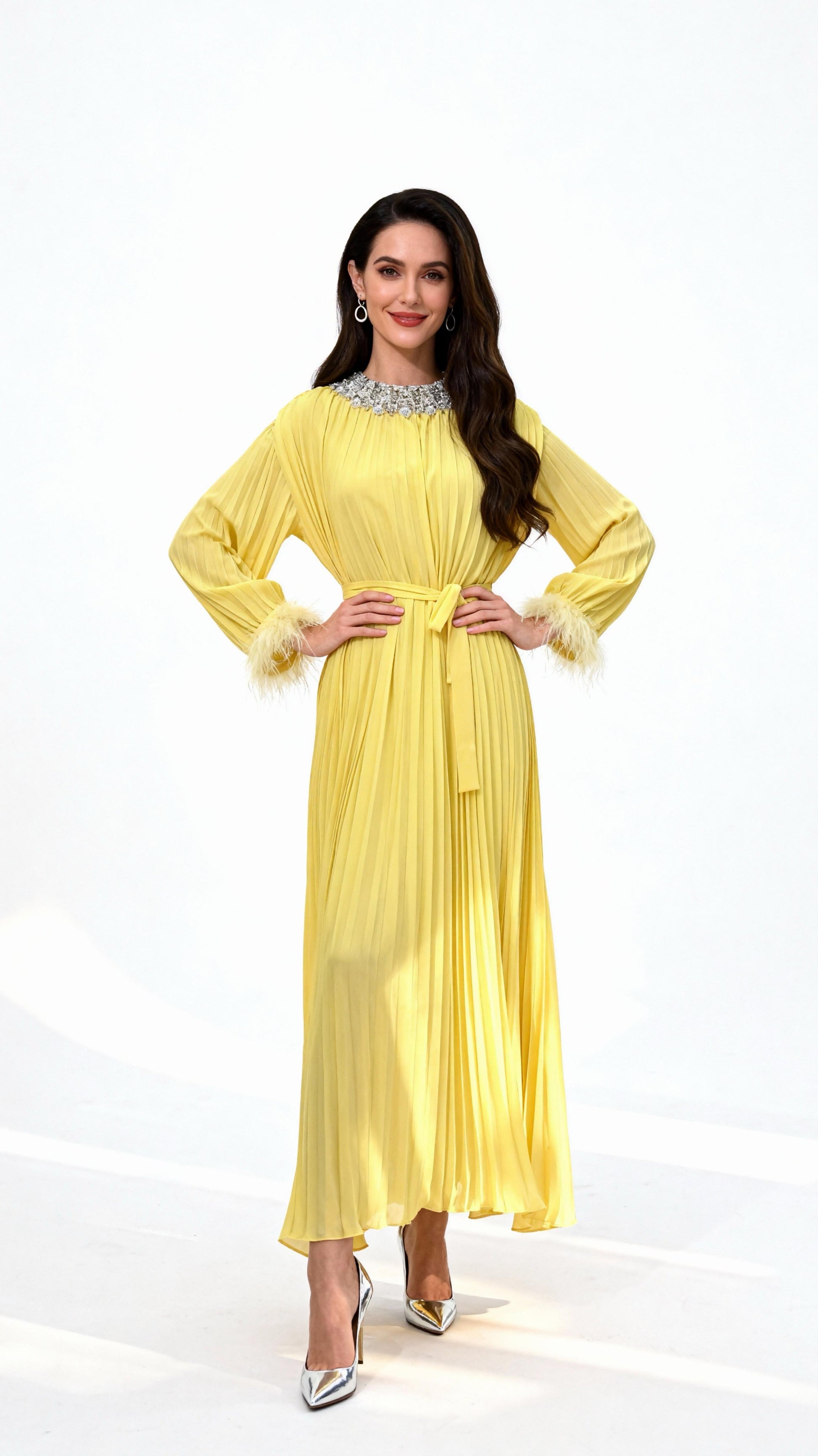 Bright Yellow Pleated Rhinestone-Neck Feather-Sleeved Maxi Dress