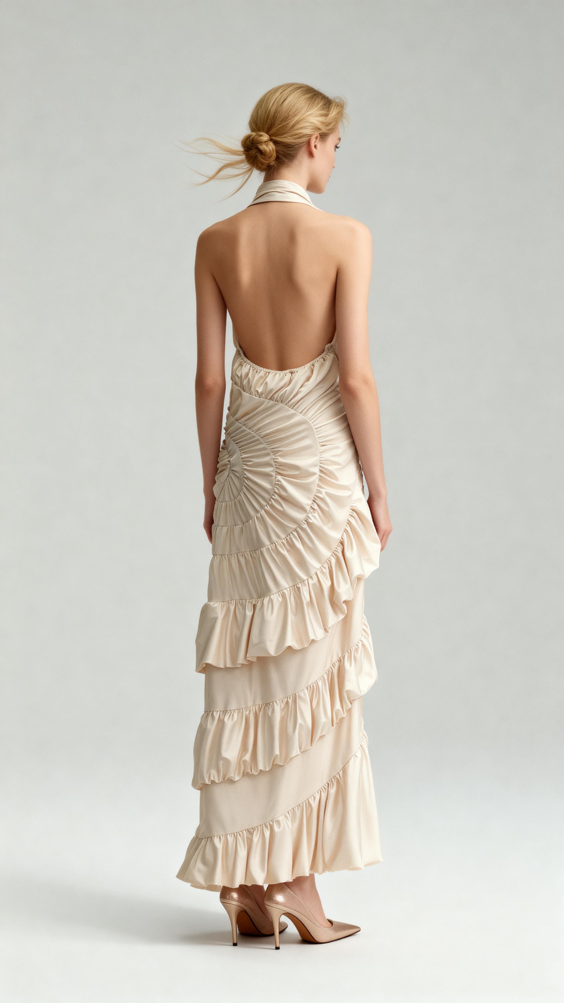Silhouette:Features a halter neckline + deep V-neck, with extensive spiral ruching across the skirt (extending from the waist down to the hem). The ruching creates a layered, wavy texture, and the hem boasts a highly draped maxi-length silhouette.