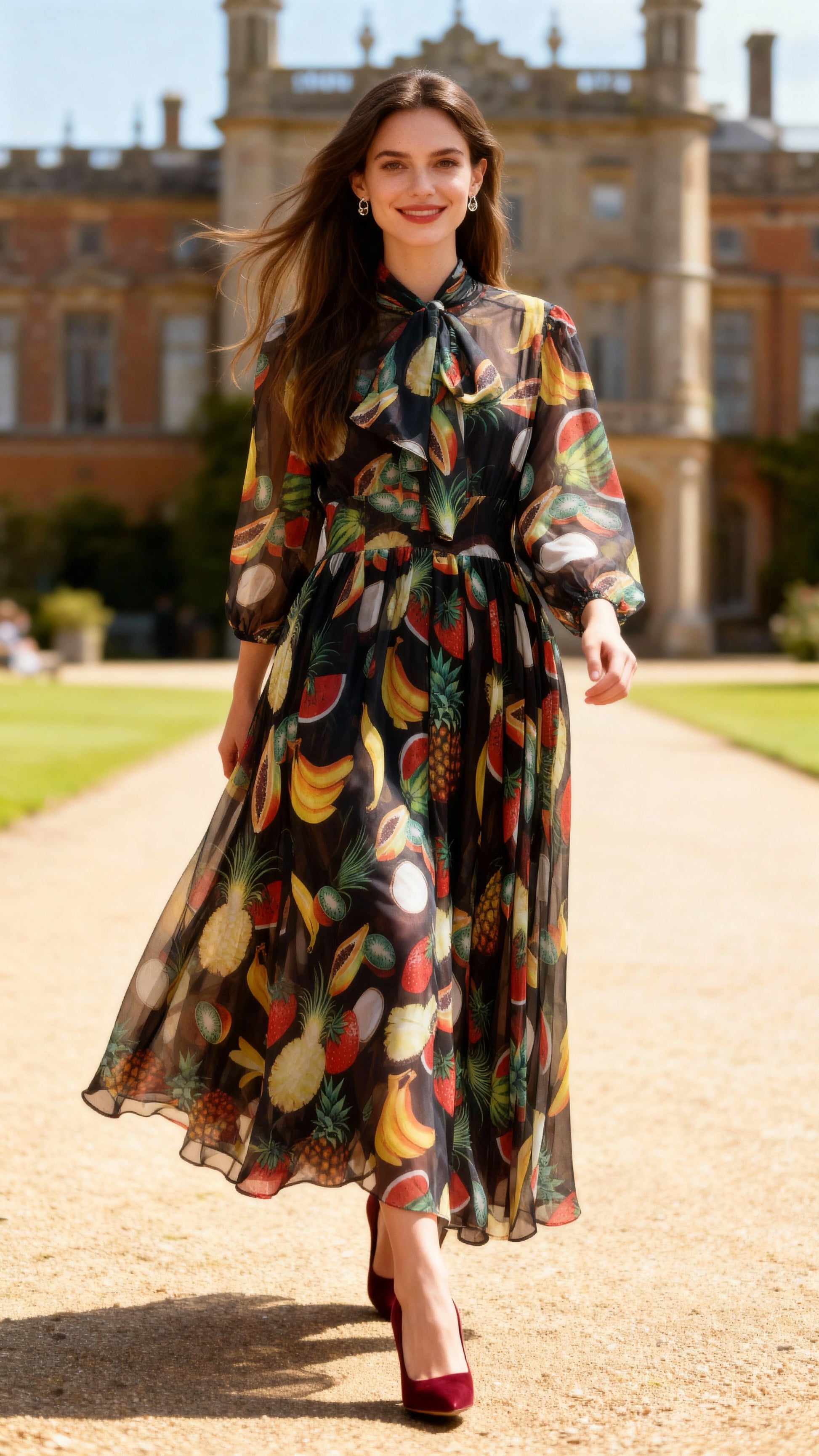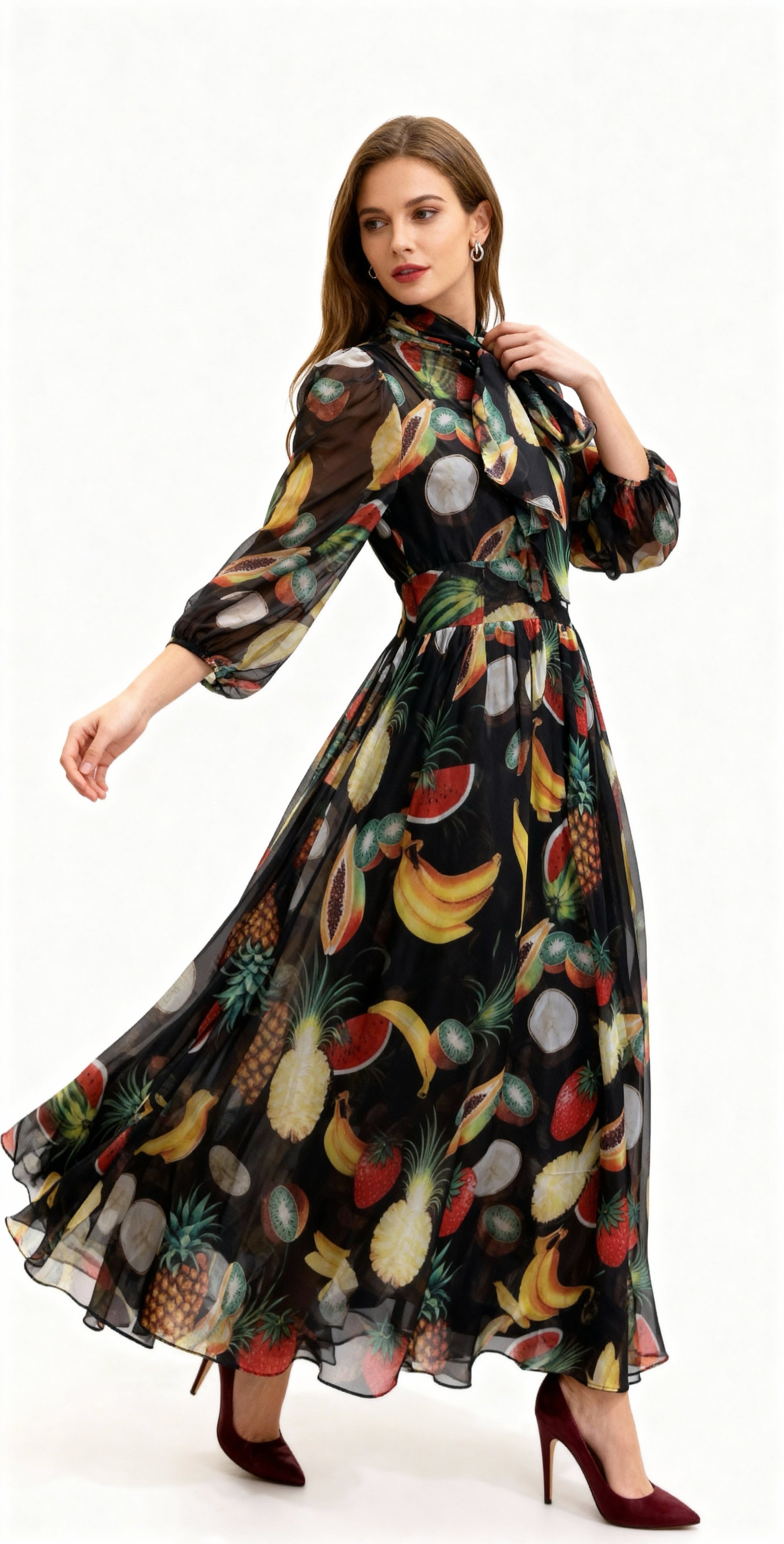 Fruit-Printed Flutter Collar Chiffon Maxi Dress