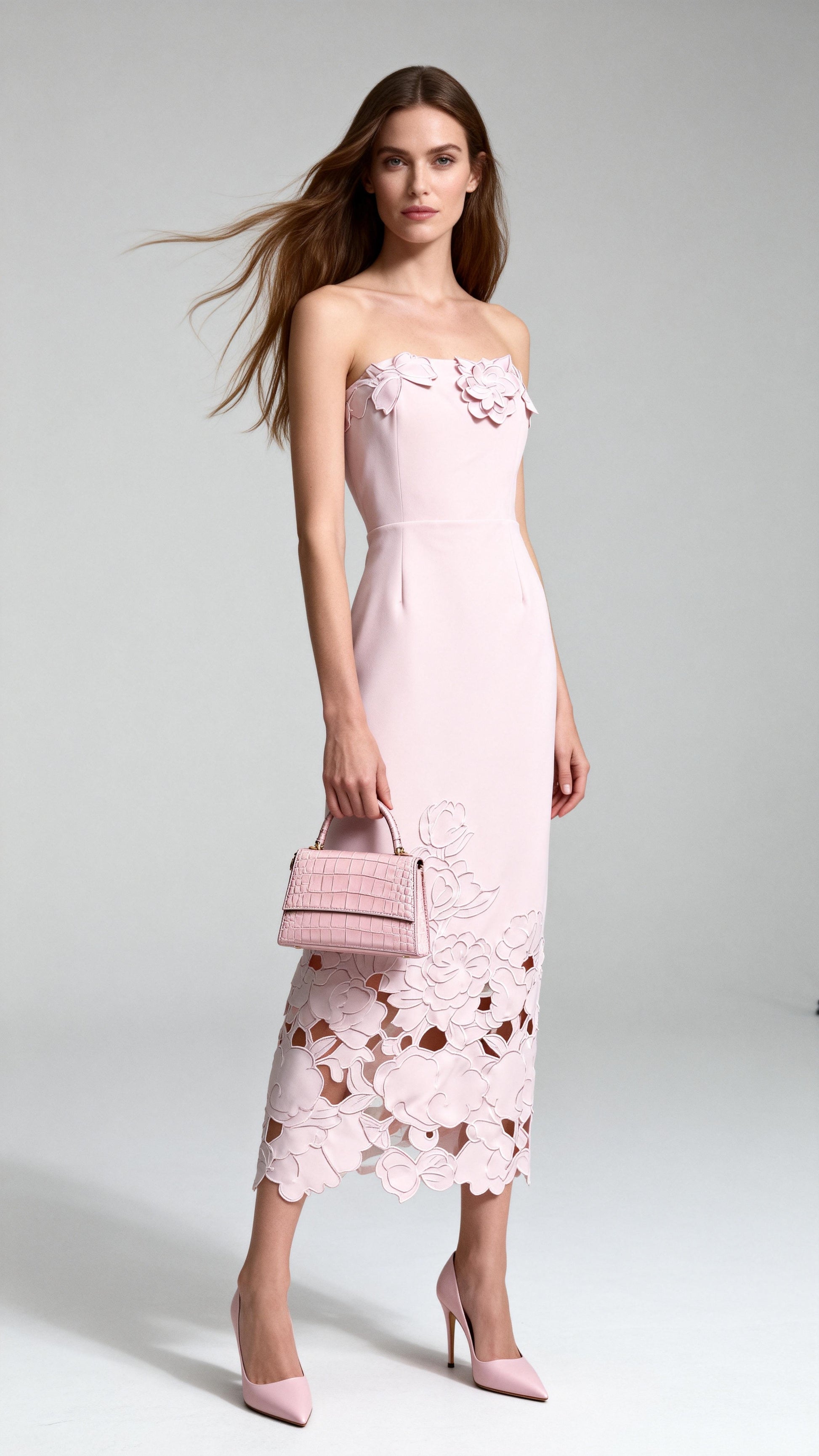 Silhouette:Features a strapless, sleeveless + slim-fit bodycon midi skirt design, incorporating a combination of 3D floral accents and cutouts — the bust is adorned with 3D flowers, while the skirt hem showcases translucent layered dimension through cutout carvings in tone-on-tone fabric.