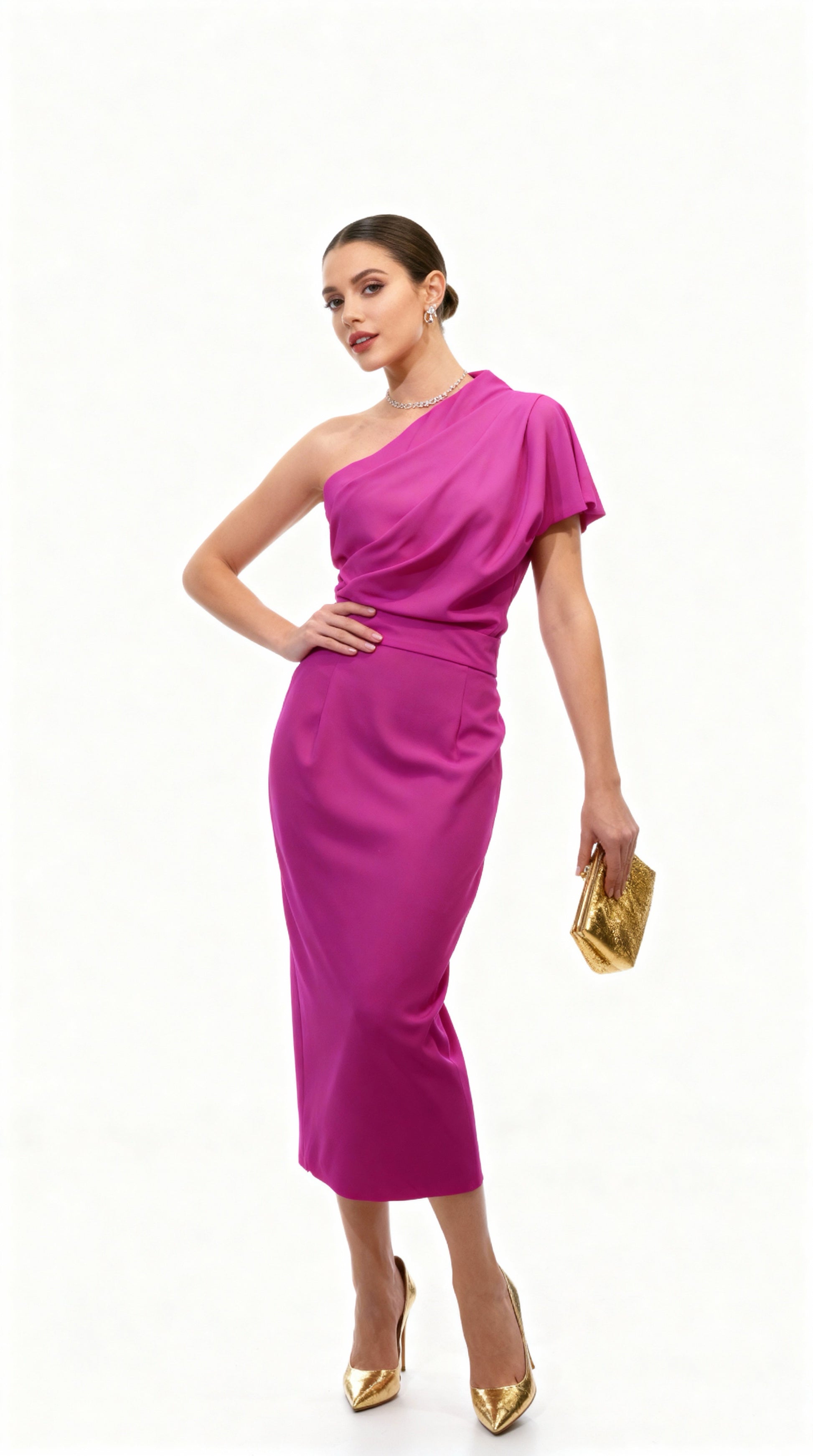 Style:One-Shoulder Asymmetric Cut Design with pleated cinch-waist detailing; The lower half is a slim-fit bodycon skirt, and the overall cut hugs the body seamlessly.