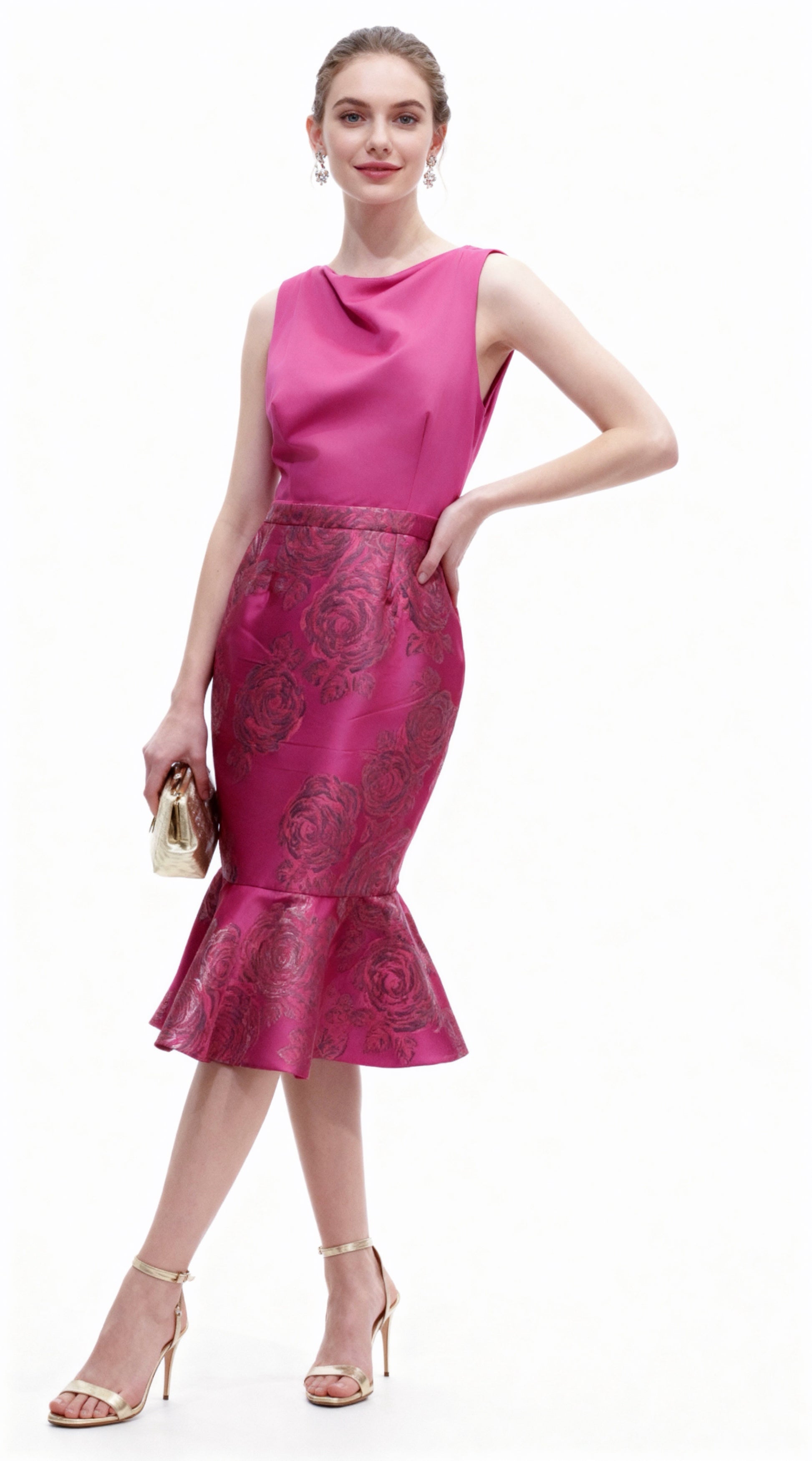 Skirt:Mermaid hem; the skirt is printed with same-color family subtle-tone rose floral patterns.