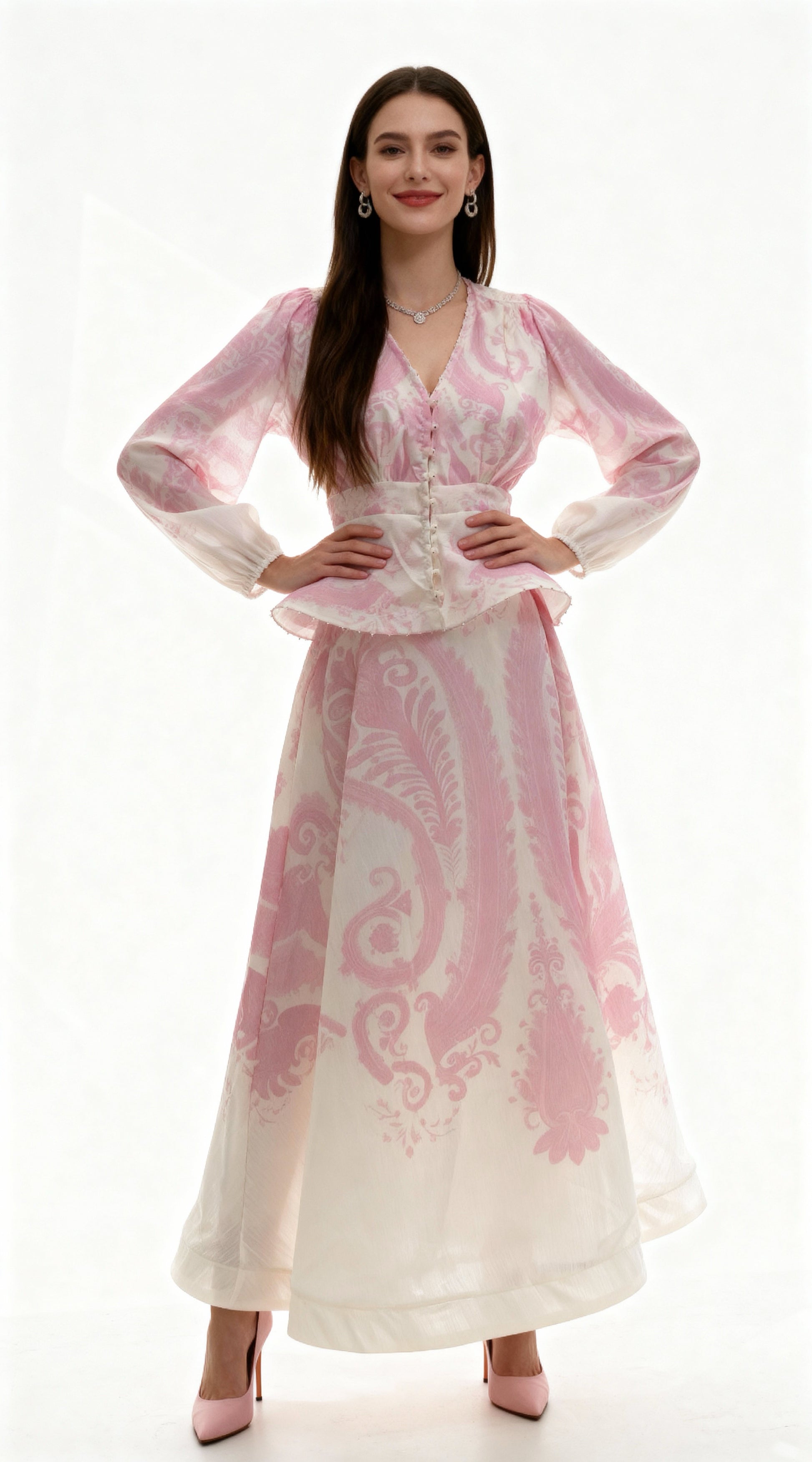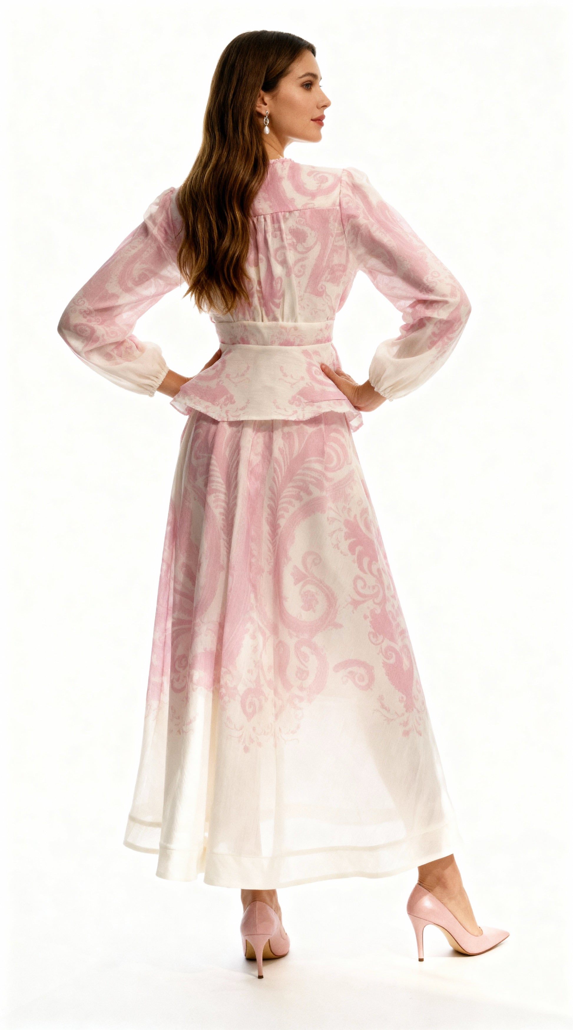 Pink and White Patterned Vintage Two-Piece Set (Waist-Cinched Top + Full-Flare Maxi Skirt)