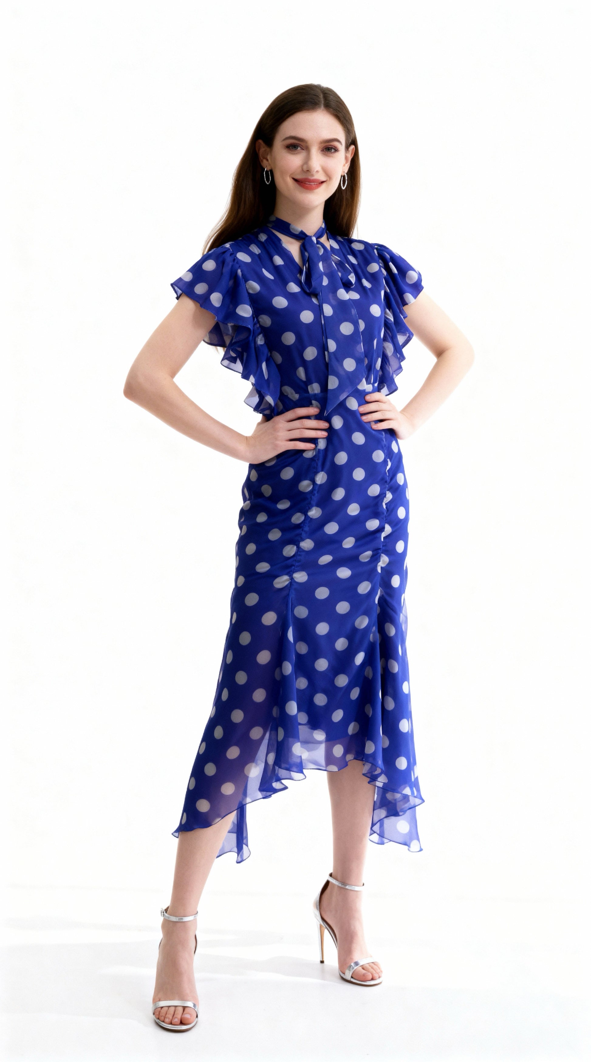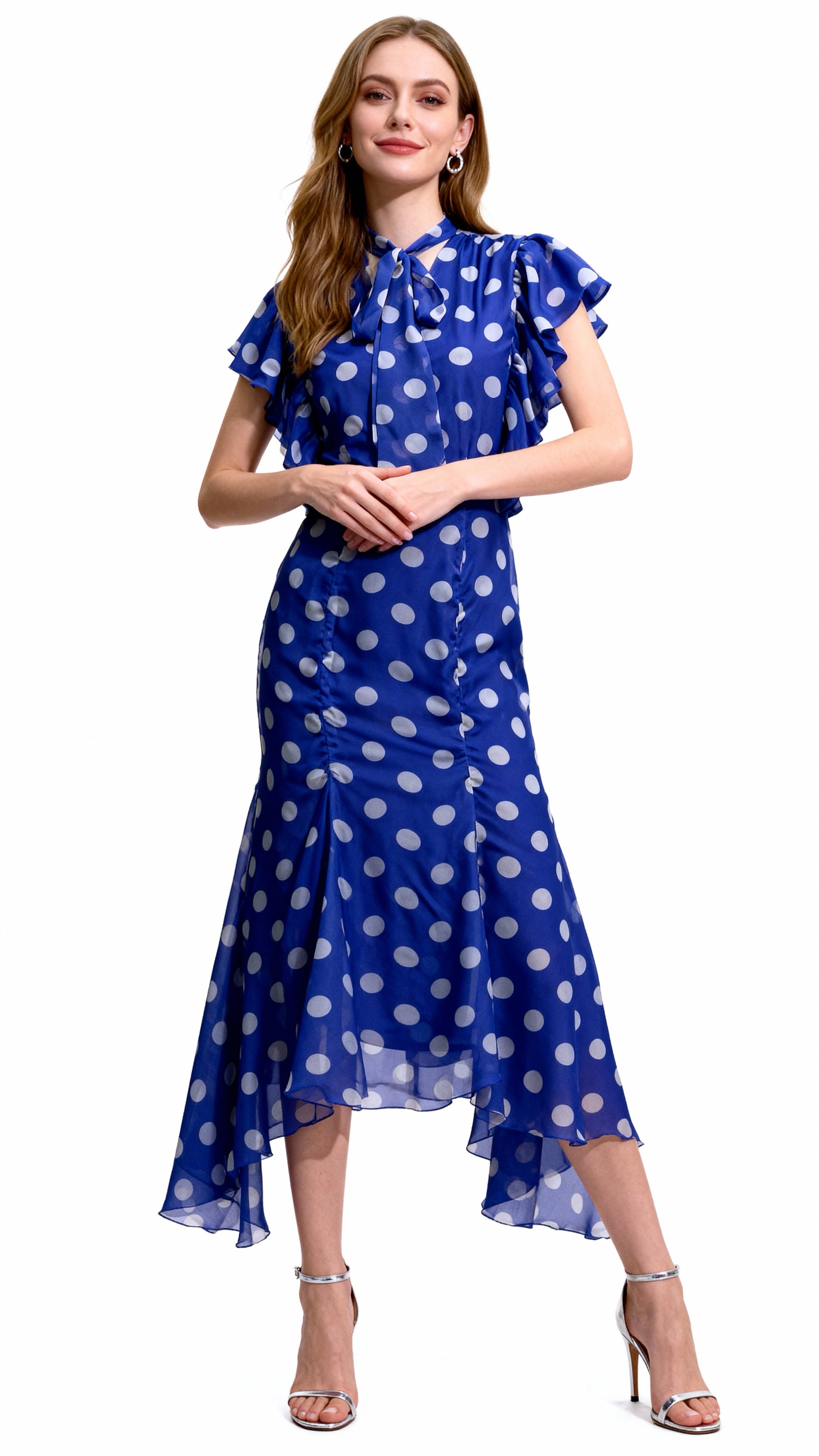 Royal Blue Polka Dot Tie-Waist Ruffled Mermaid Dress