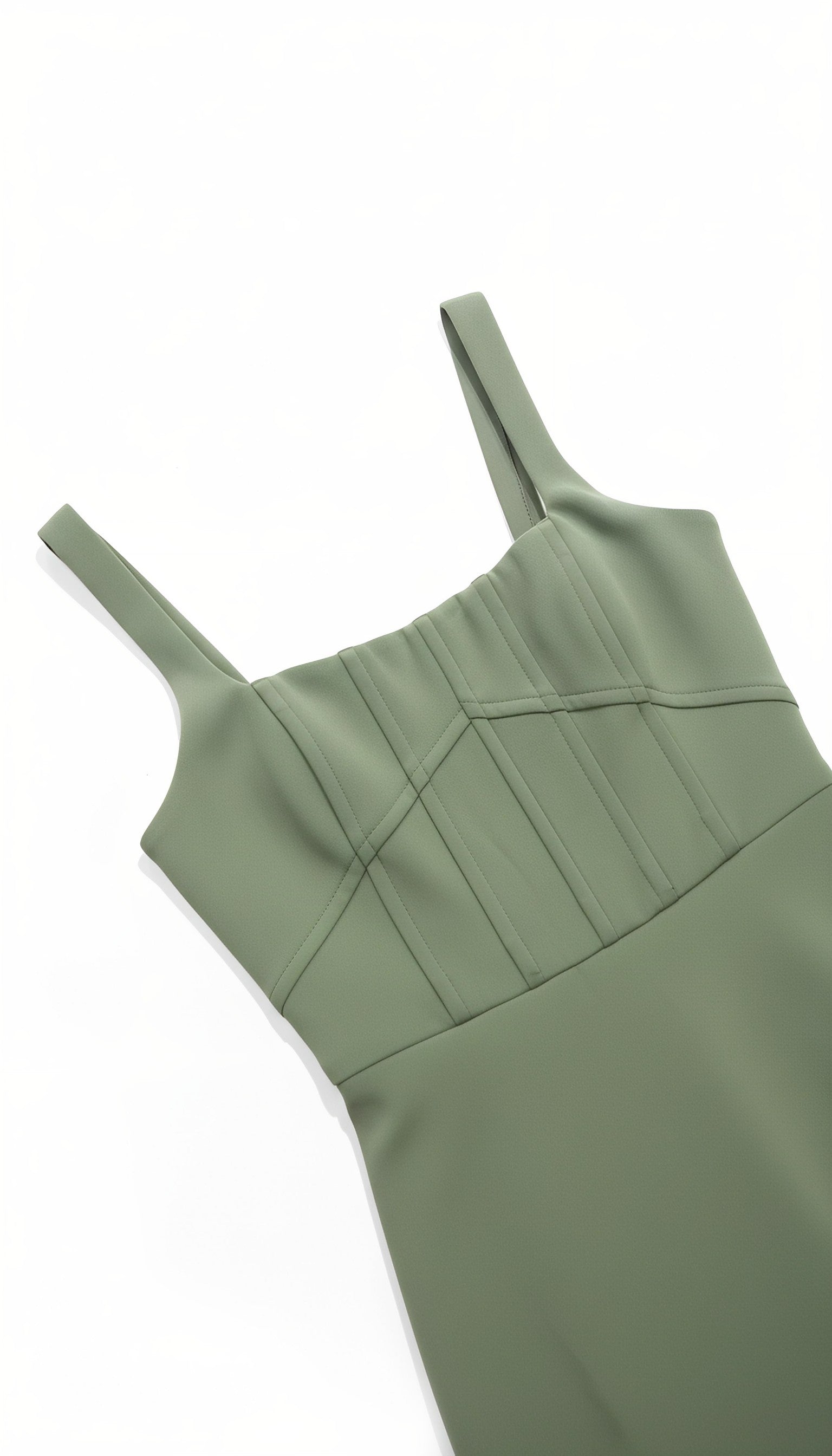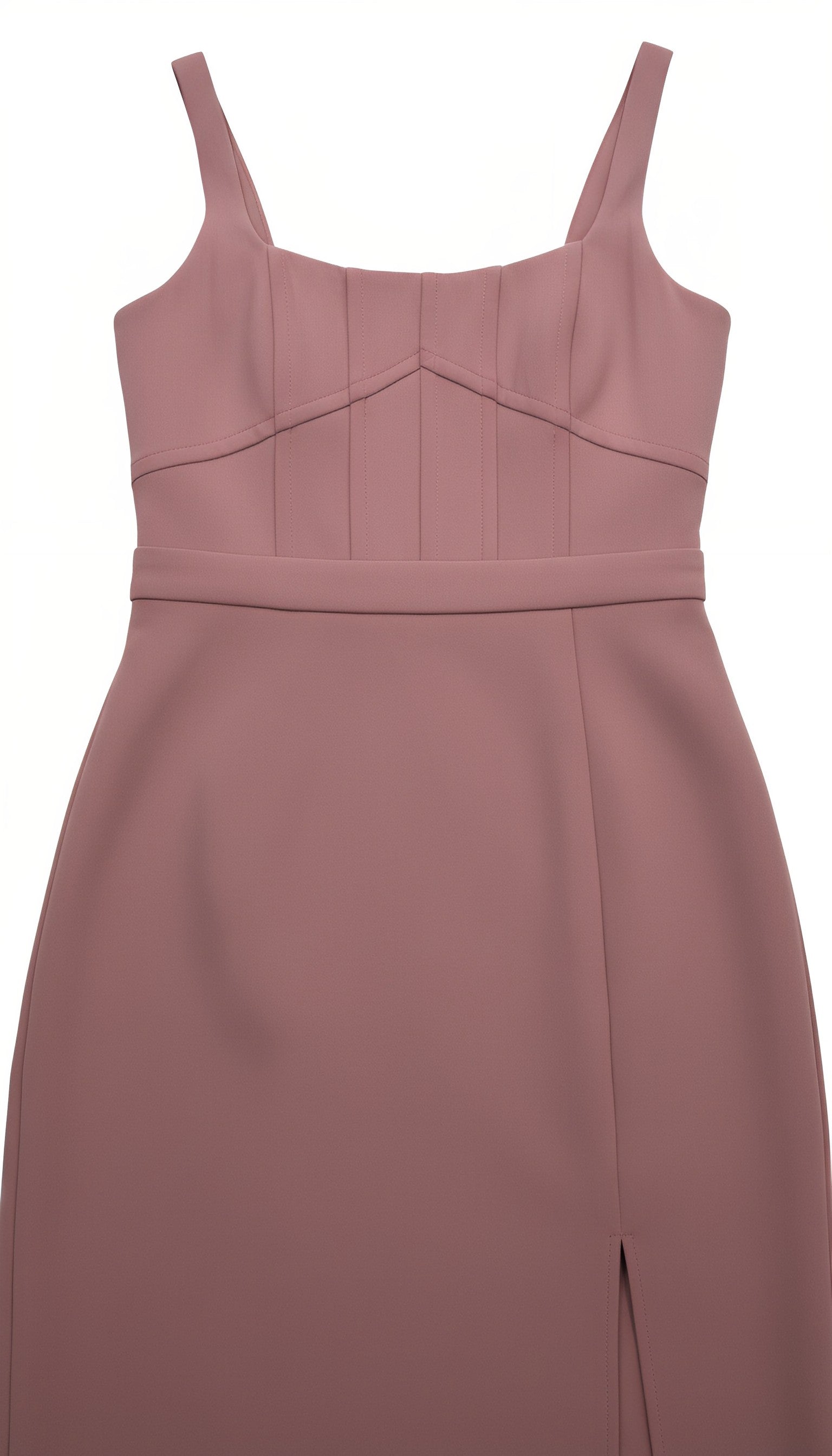Features a square neck + spaghetti straps + a figure-hugging maxi dress silhouette. The bodice boasts structured pressed pleats for a 3D textured finish; cinched at the waist, the skirt is crafted with an asymmetrical side slit that accentuates the leg line, striking a balance between elegance and subtle allure.